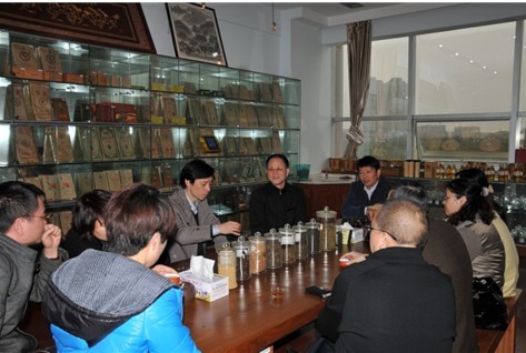 在化工楼三楼黑茶陈列室,党委书记赵运林向专家组详细介绍了公司在黑茶金花提取物方面的研究情况。专家组还现场品尝了由公司研制的极品富金花散茶,浓郁的香味、细腻的口感,赢得了专家们交口称赞。