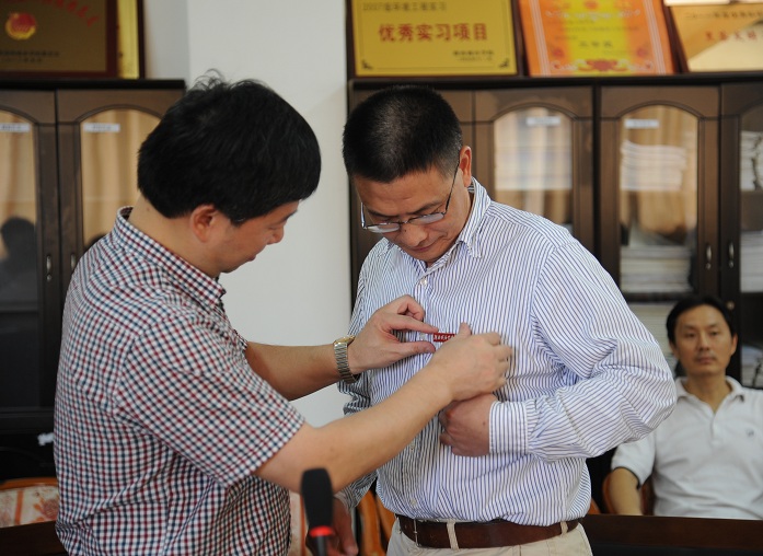龚卫明为杨小平佩戴校徽