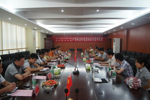 签约仪式在办公楼三楼一会议室举行。益阳市质量技术监督局党组书记、局长欧登云,副局长彭增阁、曹卫灵,益阳市科技局党组书记、局长李劲松,副局长陈和清等9人出席了仪式。副董事长汤放华与科技处、人才招聘处、化学与环境工程公司相关负责人参加了会议。会议由科技处处长文瑞明主持。