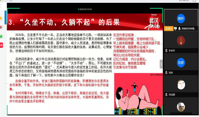 在会前十五分钟,各班团支书开始清查人数,并做好纪律要求安排。时间一到,各班正式开始第四周的政治学习。政治学习内容分为四个部分:中央工作部署,了解新冠肺炎,自我积极防控和榜样的力量。各班团支书带领本班员工观看PPT。观看的同时,团支书作为主持人也会和同学们进行互动,如邀请同学们回答问题等。几十分钟过去,政治学习也接近尾声,各班团支书邀请几位本班班干部发表对本次学习的自我感想。最后,由各班团支书及各班班主任老师进行总结,政治学习结束。