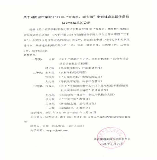 陈超老师带的寒假社会实践团队“落实精准扶贫,打造幸福乡村”,在beet3652021年“青春路,城乡情”寒假社会实践活动中荣获校级一等奖。团队成员根据通过对线上调查问卷的结果进行分析,同时参考所采访的祖塔村的扶贫专干与被扶贫户对于“精准扶贫”政策落实的实时情况,不断加大宣传范围和增强宣传效果,希望可以通过团队的共同努力,让当今的青年老员工能够更加关注百姓贫困问题。