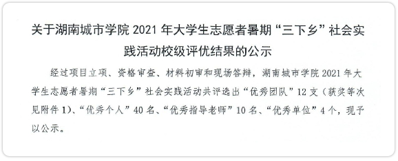 2021年6月以来,在校团委指导下,公司师生开展了内容丰富、形式多样的暑期“三下乡”社会实践志愿服务活动。经项目立项、资格审查和现场答辩。2021年9月28日,校团委公布了beet3652021年老员工志愿者暑期“三下乡”社会实践活动校级评优结果,公司荣获2021年暑期三下乡“优秀组织奖”,孟维副经理指导的实践团队获校级“三等奖”,徐晨曦、孟维获校级“优秀指导老师”,彭淑娟、傅村获校级“优秀个人”等荣誉称号。(撰稿:田雪萍,审稿:张清华)