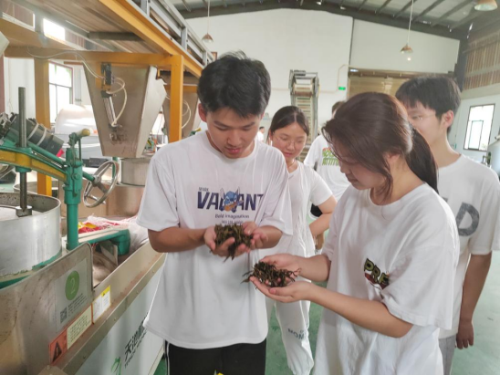 “品质好的安化黑茶,外观一般条索紧卷,香味醇厚,带有淡淡的松香,汤色橙黄明亮,叶底柔韧鲜活。这是今年新制的安化黑茶,茶味浓郁,入口略涩,后有回甘。大家尝尝看是不是这样?”在企业负责人张浩亮的耐心讲解之下,实践团队成员对安化黑茶有了进一步的了解,同时也详细调研了企业在产品品质提升和质量检测方面面临的一些需求。对于力所能及的问题团队就地取材,借张桌子,架上比色管、添加准备好的各种试剂,在刘石泉教授和各位博士老师的指导下,对该公司黑茶产品中茶多酚等成分进行了现场化验,并对实验数据进行了分析。团队还对该企业多款黑茶产品进行了取样,以备后续更深入的检测和分析。