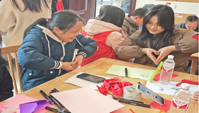 活动开始时,青年志愿者服务中心成员带领志愿者们教残疾人学习绘画、折纸和剪纸,这些作品不仅展示了残疾人们的才艺,更体现出他们对生活的乐观与积极。教学环节结束后,在残联工作人员的引导下,志愿者们和残疾人朋友们一起学习“手势舞”。活动最后,残疾人朋友们举着各自的手工作品。