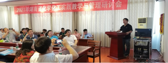 中南大学刘耀驰教授做了“虚拟仿真实验教学项目建设”主题报告。湖南化工研究院有限公司陈明研究员、中南林业科技大学旷春桃教授、湖南工程公司皮少峰教授分别就实验室记录及规范要求、化工设计竞赛现状和问题及改革思路、实验室建设及实验教学改革做了专题报告。