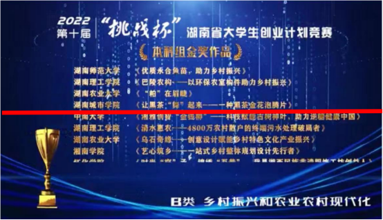 经过激烈角逐,公司黑茶基地由胡治远、周晓红老师指导的黑茶创新创业团队“让黑茶舞起来——一种黑茶金花泡腾片”,在乡村振兴和农业农村现代化组大赛上荣获金奖,充分展现了黑茶金花重点实验室、安化黑茶非遗传承湖南省社会科学普及基地实践育人、培养创新型应用人才的良好效果。(胡治远供稿 刘石泉审核)