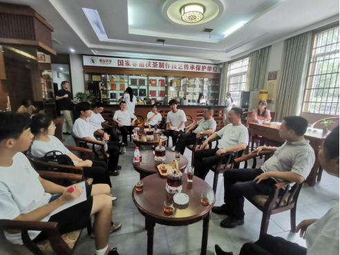 实践活动第三站-湖南省益阳茶厂有限公司,团队成员和指导老师在公司市场部杨雨带领下参观了黑茶生产车间,黑茶酵库,益阳茶厂黑茶博物馆等,和益阳茶厂有限公司副总经理,伏砖茶制作技艺国家级非遗传承人刘杏益就黑茶发展历史和黑茶产品的传统与创新展开了深入的讨论,并详细了解了该公司的创新产品-茶守艺暴打油黑茶,对其创新元素进行了交流。通过深入交流学习和讨论,茶研科普和茶心科技创新创业实践团队成员对黑茶产业和产品创新有了更深入的认识,也提出希望能结合企业需要,为茶产业和茶产品的创新贡献力量。