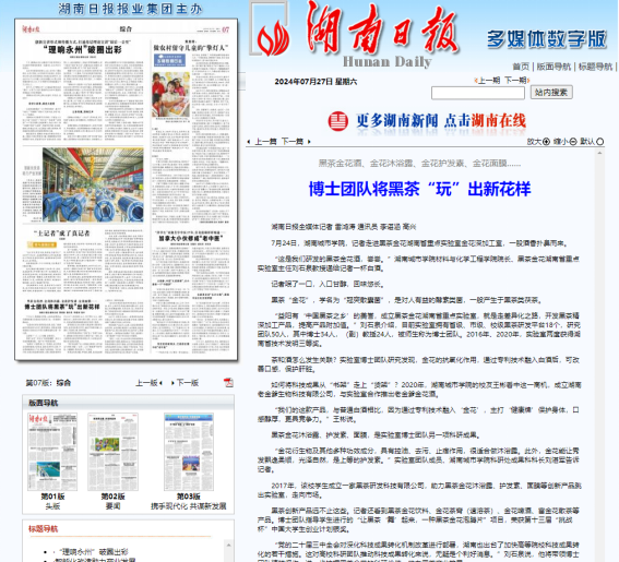 2024年07月27日,湖南日报综合版以“黑茶金花酒、金花沐浴露、金花护发素、金花面膜……博士团队将黑茶‘玩’出新花样”报道公司黑茶博士团队在黑茶金花精深加工方面取得的成绩。报道网址: