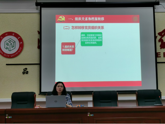接着,陈艳姣同志向大家介绍了:什么是党员组织关系?怎样转移党员组织关系?如何填写组织关系介绍信?党员档案的重要性以及保管注意事项等。同时强调了组织关系转接中可能会遇到的情况,并进行了现场答疑。