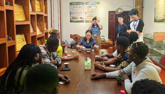 加纳国际交流生们进行泡茶和品茶体验活动,利用基地自制金花散茶、茯砖茶、黄茶、红茶和绿茶进行品评。同学们对中国茶的种类、冲泡方式、滋味等表现出浓厚兴趣,特别是对黑茶基地自制金花茶十分喜爱。(一审:李滔滔 二审:刘石泉 三审:钟桐生)