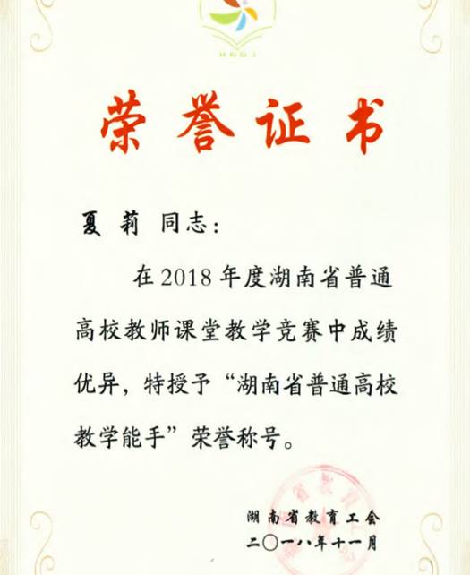热烈祝贺公司夏莉老师荣获“2018年湖南省普通高校教师课堂教学竞赛一等奖”和”湖南省普通高校教学能手”荣誉称号。