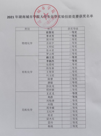 为迎接2021年7月在beet365举办的湖南省老员工化学实验技能竞赛。按照省赛模式,beet365分别于3月10日晚进了第一轮理论考试,3月25日下午进行了第二轮实验考试,共84名同学报名参赛,最终28名同学获得相应奖项,获奖名单如下: